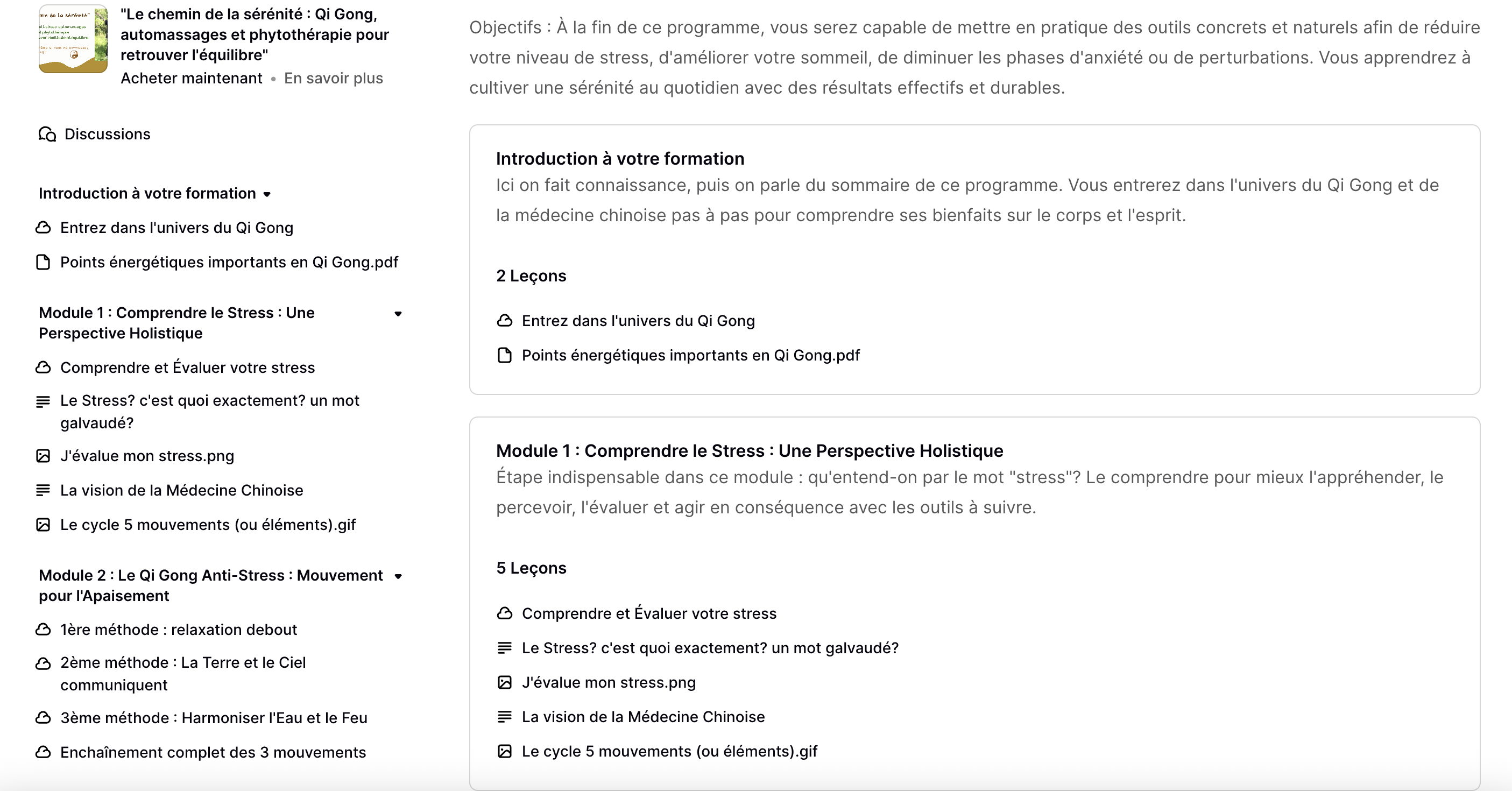 Ici on fait connaissance, puis on parle du sommaire de ce programme. Vous entrerez dans l'univers du Qi Gong et de la médecine chinoise pas à pas pour comprendre ses bienfaits sur le corps et l'esprit.